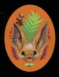 Bat prints in hanging frame duo. Pictured Goldie and Pinky; also available in Big Ear, Vampy, and Vlad. Please indicate choice and order of bats in comments. Vintage metal frames are connected by chain with glass front.