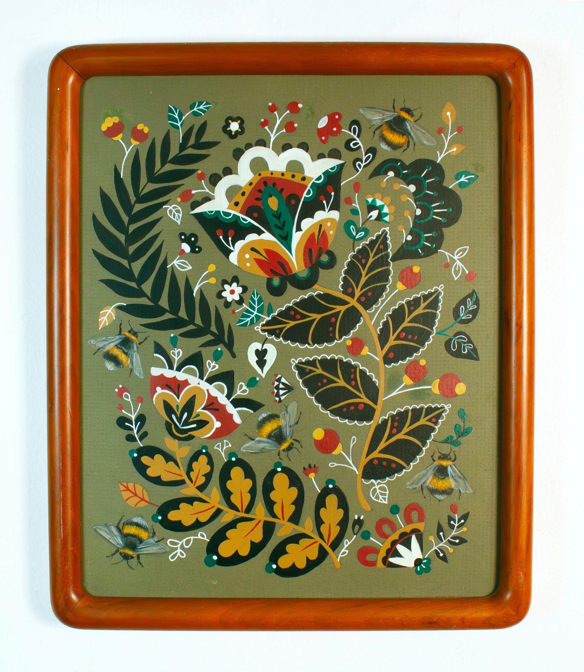 Original painting of Buzzy Bees surrounded by colorful folk art flowers. Art is hand done in acrylic paint on colored board in warm wood frame.