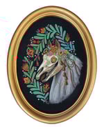 Framed archival pigment print of "Mari Lwyd" painting in gold vintage wooden frame.