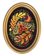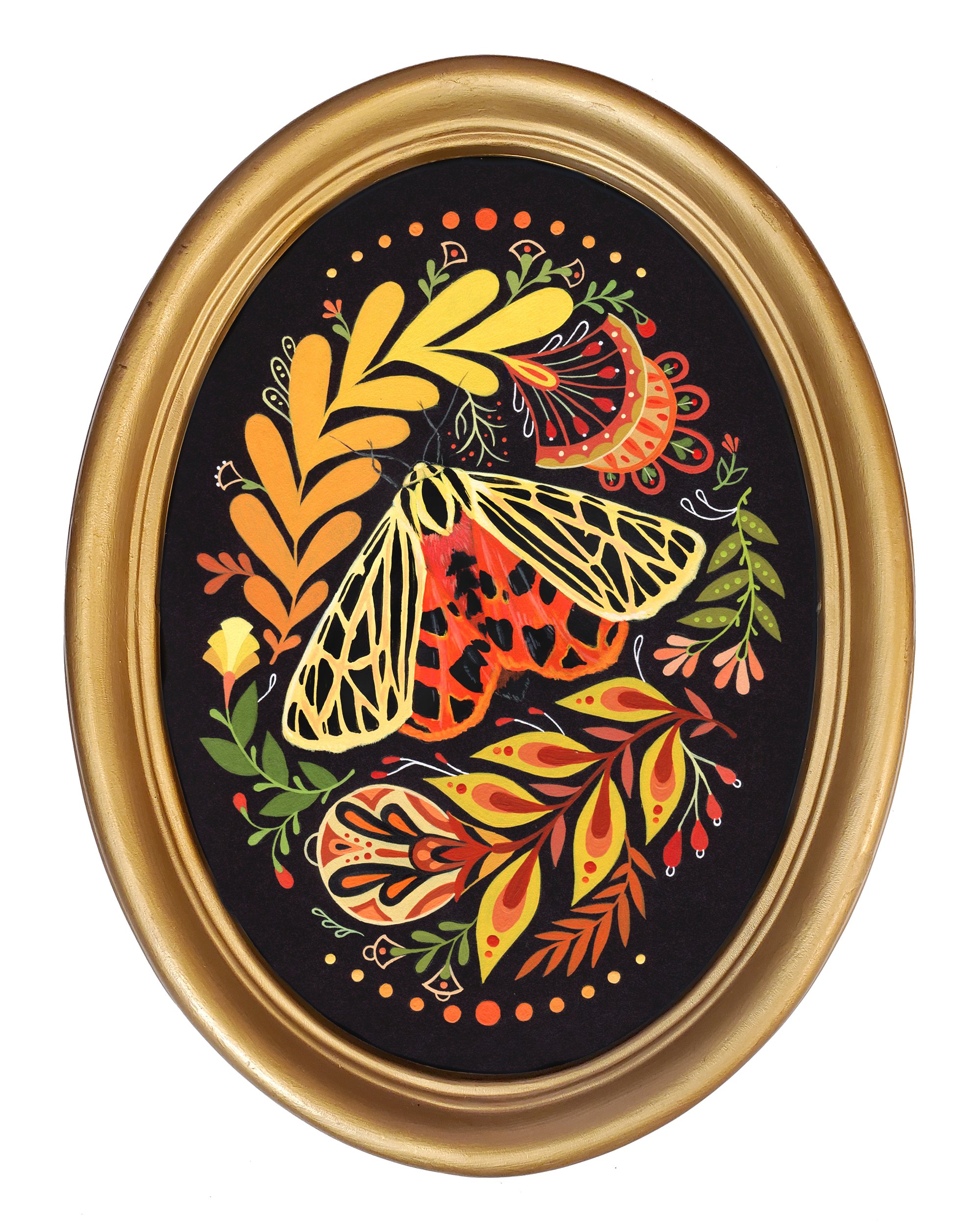 Framed archival pigment print of "Moth to a Flame" painting on matte paper in vintage oval frame.